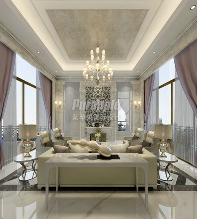 设计说明:设计方案最大化的利用美丽的外景,运用了大量的落地窗。客厅家具、沙发的摆放方向都是欣赏窗外景色的最佳位置。室内整体色调介于白色和灰调之间跳转,点缀以银色金属质感的细腻线条,让整体空间显得优雅而高贵。在材料选用上,整个项目用到的材料都是进口高端品牌,如进口大理石,硬度和光泽度都非常好,突显了尊贵气息。