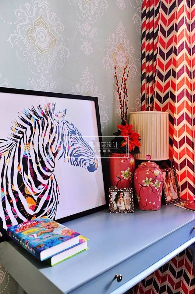 蓝色、橙色为主色调,打造温暖、阳光、清新的卧室。橙色在斑马纹、桌椅、地毯的使用上,就算是只作为装饰点缀也能获得非常棒的视觉效果。