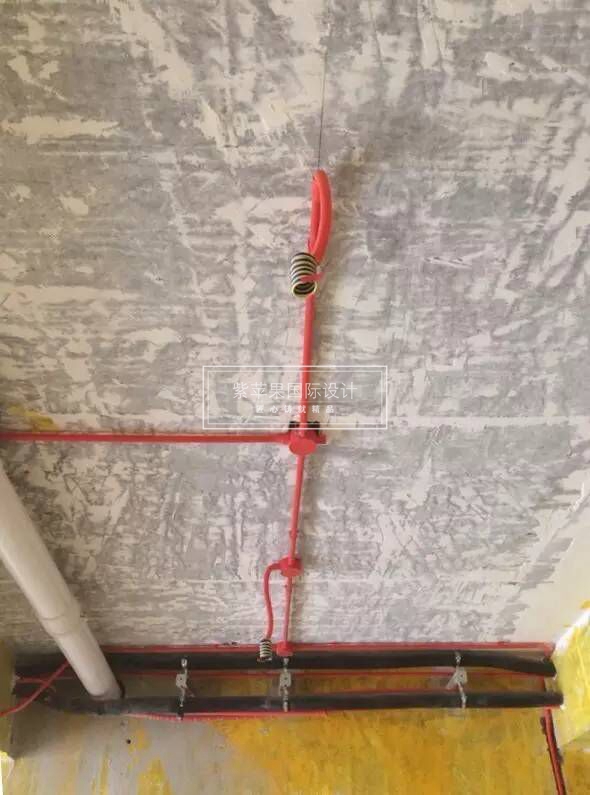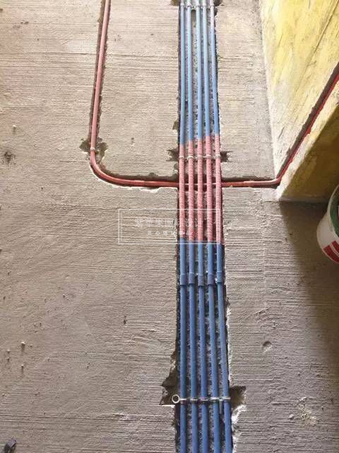 开槽布管:隐蔽管线,须按横平竖直的原则,弹线后用切割机开槽,承重墙、剪力墙、梁、柱等处不宜开深槽,不得切断钢筋。电源线、信号线宜用阻燃型护套软管保护(黄蜡管)。