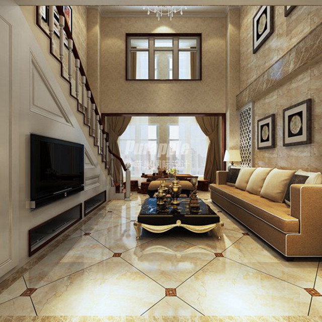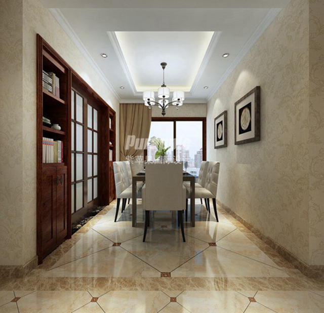 米黄的墙纸与客厅的抛光砖相互映衬,在水晶吊灯的照射下,使得整个空间更显亮堂;客厅与餐厅相联通,扩大了空间。