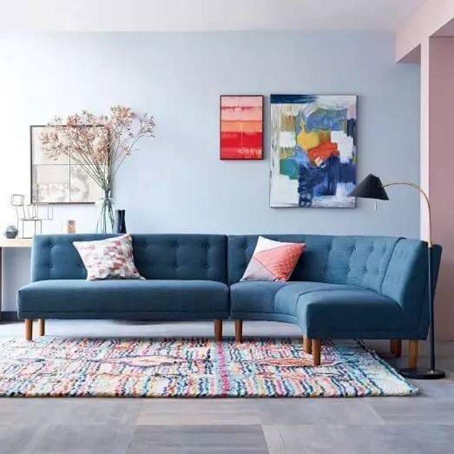 蓝色系沙发搭配指南:颜色偏深的蓝沙发,夏日能给人带来凉意的魔力。搭配浅色系的抱枕或者来个撞色抱枕也是很好的选择,简洁金属质感的灯,线条感的茶几,来盆绿植,让这个夏天有肆意翱翔蓝天碧海的清凉感。