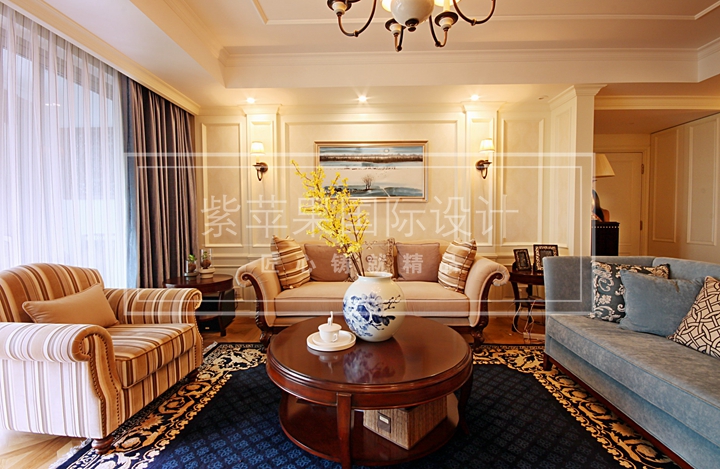 本案坐落于上海外滩滨江区域,地处世博滨江黄金水岸,隔江对望世博园,优越的地理环境造就豪宅生活体验。了解客户对高端生活品质的追求,紫苹果装饰设计师利用美式混搭风格,以多元化的手法与视角,共同为客户打造了一个赏心悦目,舒适贵气的生活空间。