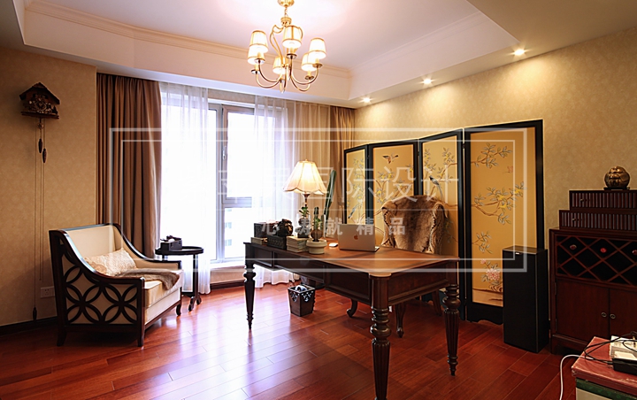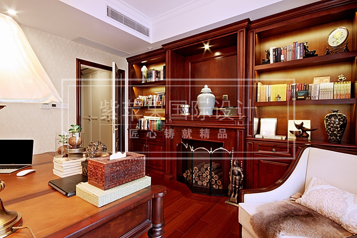 书房空间解析:书房是美式别墅装修中家庭空间文化气息最为浓厚的地方。色彩厚重的实木家具让书房呈现浓郁的典雅气质,充满美式风格特色的壁炉,古典配饰,糅杂中式风格的屏风,让空间更添文化与品质感!