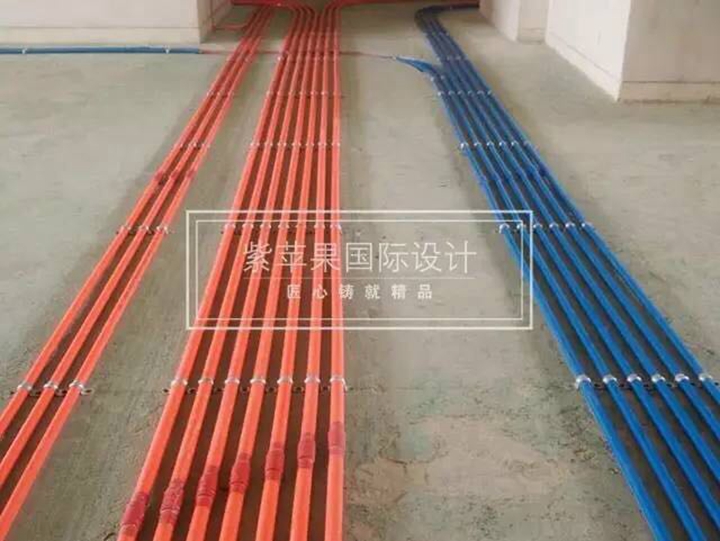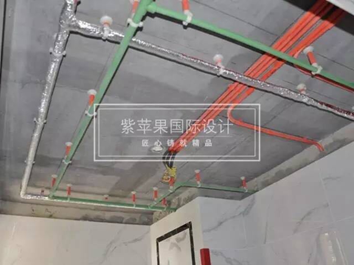 水管除了分层分色排布,便于后期维修,还要进行热水管保温处理哦,防止热量散发。紫苹果顶面管线排布要求:宜分层布置,从上到下分别为电路、热水管、冷水管、下水管,垂直间距约为50mm,不宜使用过桥弯。