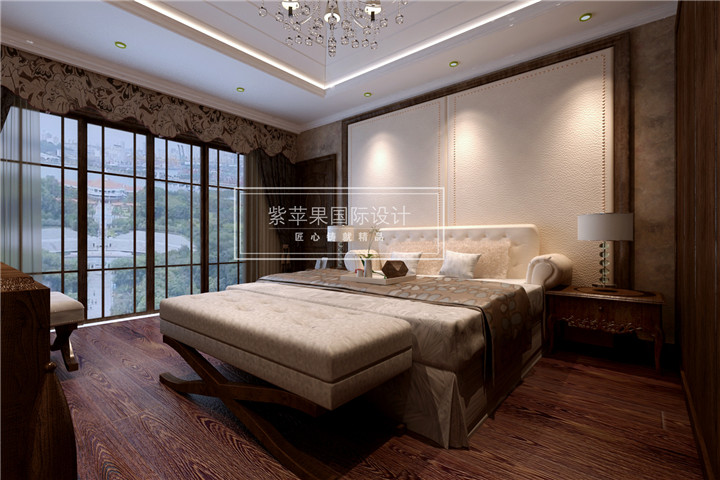 素雅图案的窗帘、帷幔、床饰、墙纸等装饰,无疑体现出一种浪漫的家居空间环境。落地窗的设计让整个卧室空间立体感倍增,放眼望去,远处的树林江河尽收眼底,让人在早晨醒来感受到大自然带来的舒适。和奢华的欧式风格卧室不同,但是处处都彰显着典雅大气和品质感。