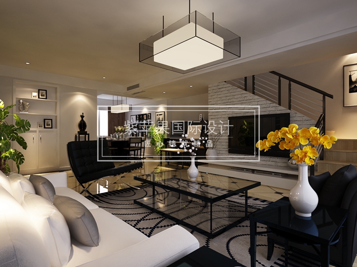 在这个现在风格气息浓郁的客厅里,别墅设计师大胆的创造一个坡式楼梯入口,给有限的空间加深了延展性,使原本固定的空间一下子变得富有想象力,目光会不由自主的顺着楼梯爬升,勾起你思想的韵味。