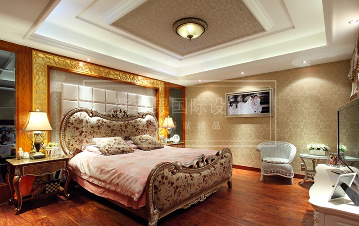 欧式的大床总是能撩起人的美妙幻想,衬托的白色格子幕墙刚刚好对应着线条明朗的天花板,一盏小夜灯,引燃了整个空间浪漫奢华的氛围。