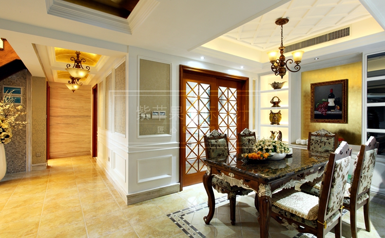 喜欢浪漫主艺的人一定不要错过欧式家居设计,印花的桌椅始终是设计师的最爱,酒橱设计方便使用,栅格的门板分割着两个厨房和餐厅空间,只需轻移数步,就能畅想丰盛的大餐,或许点上少许蜡光,开一瓶上好的红酒,晚餐也就变得更加浪漫起来。