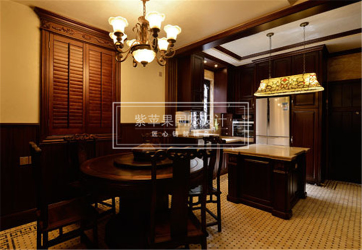 餐厅中,极具东方气息的八仙桌和西式大理石面料理台和谐共存。壁炉作为西方文化的典型载体,能营造出浓浓的西方生活情调。嵌入式的冰箱和烤箱极大限度利用了空间,既保证了现代化家电的使用,也不破坏整体的古典设计感。