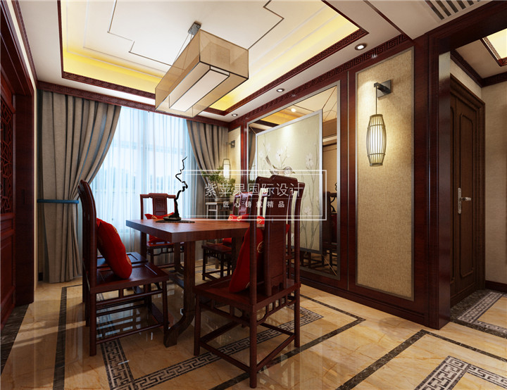 餐厅里,一副水墨花鸟画装饰勾勒了文人的附庸风雅,而红木桌椅的朴素大方,宫灯的气派庄重,鲜艳中国红靠背垫,则彰显了中式风格的典雅端庄,古韵芳华。