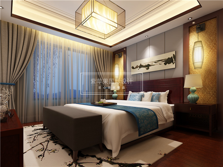 素雅又不失高贵的的窗帘,让安全感和舒适感充盈于整个卧室。大气的红木床上,艳而不俗,宫灯散发着温润和谐光,以自然之美让人陶冶情操,怡情娱趣。