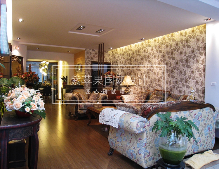 整个居室布置宽敞,呈现出一种悠然闲适的状态。格莱美碎花墙纸营造清新自然的氛围,印花布艺结合现代简约的家居设计,整个别墅装饰给人非常惬意的感受。