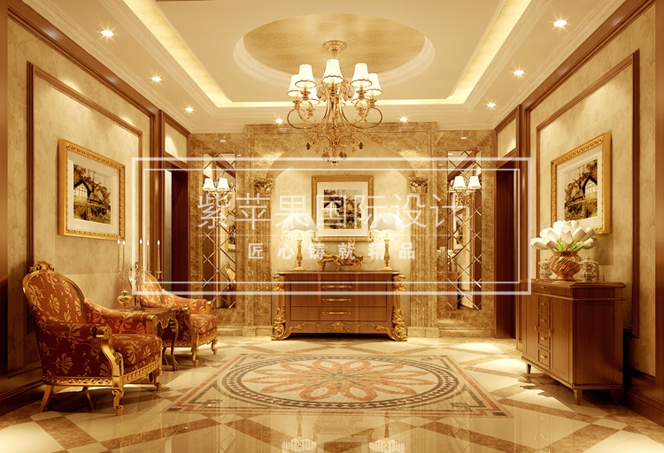英式别墅装饰设计在不同房间实用功能的基础上,以欧式古典家具、巨型水晶吊灯、罗马柱、壁炉等打造华丽雍容的英式氛围,同时,在保持整体新古典风格不变的前提下,使每个房间各具特色,融入了古典中式元素,这就使本案具有更为丰富多解的诠释空间。