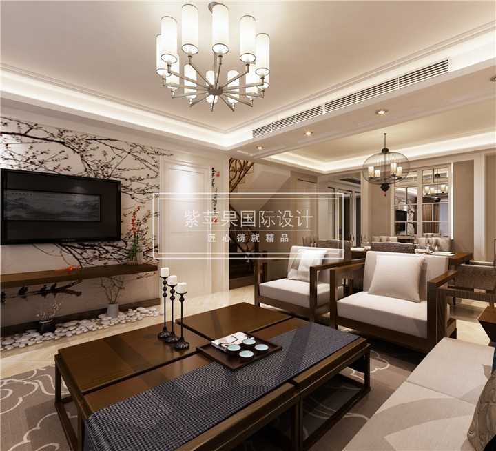 客厅的设计整体看上去以白和原木色为主,清新现代之余还保留着传统中式的古色古香。电视墙上的梅花壁画和传统的原木家具相结合彰显着中式的高贵典雅。同时椅子的设计也改为直线型,不再是明清时期典型的圈椅造型,坐垫选择纯白色也是打破了传统的色彩搭配,整个风格多了几分时尚。吊灯既不是传统的宫灯,也不是金碧辉煌的巴洛克风格水晶吊灯,造型简单而又别致,让整个房间简单中透着精致。