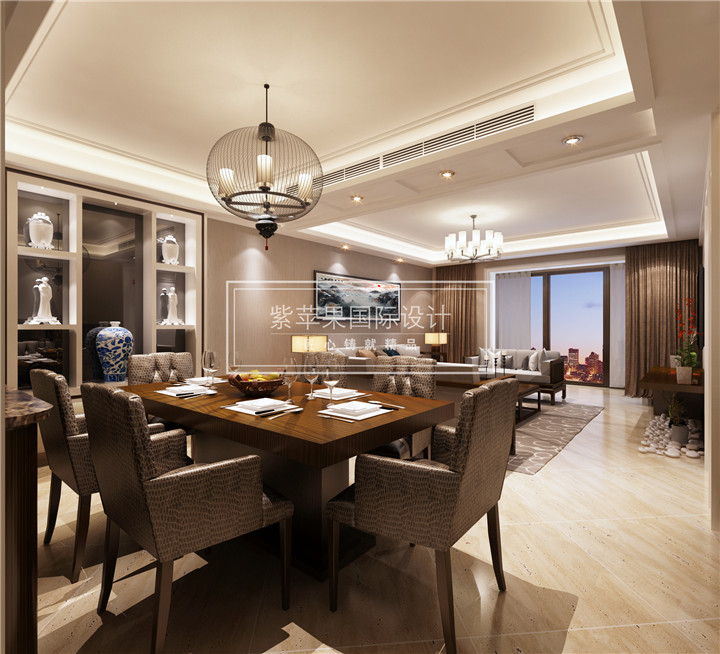 餐厅的设计也是别具匠心,现代风格的餐椅造型跟新潮的布料风格搭配,时尚而又强调实用性。亮眼之处是鸟笼造型的吊灯设计又还原了传统的中式风格,同时搭配餐桌上的红酒杯,新中式的魅力得以完美地展现。