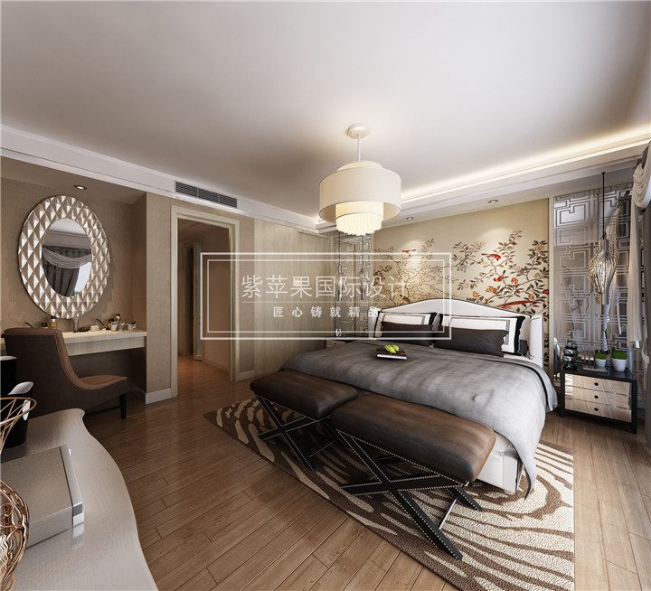 主卧的设计也摒弃了传统风格的一些元素,像窗棂,床幔等等不再出现,富有现代气息的床品与传统气息浓郁的木质格栅相辅相成。这里的吊灯设计又不同于其他居室的风格,沿用的是古典宫灯的造型,却不是那种暗黄的灯泡,而是明亮的白色灯光。这样保证每个居室整体一致的同时,每个居室又各具特色。