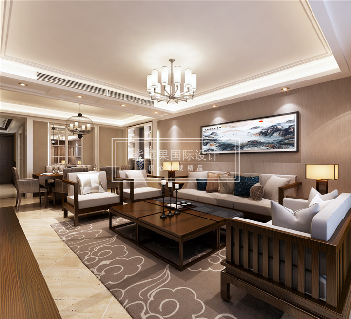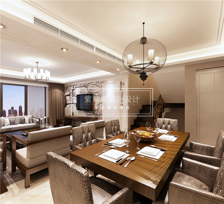 因为业主是一个喜欢中国传统文化但是又紧跟时代潮流的人,所以我们就为其量身定制的新中式风格。既保留了中式风格的古朴厚重又多了几分现代的时尚清新。比如该客厅的设计,依然是木质家具,特别是鸟笼造型的吊灯设计都沿袭了传统中式风格,主人公的东方情怀也得以体现。同时又不同于明清家具的那个古红色,也不同于明清座椅的曲线造型,座椅都是采用现代感十足的直线造型,在保证现代感的同时又体现了主人公的端正务实。