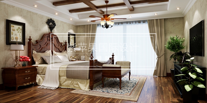 卧室:美式家居的卧室布置较为温馨,作为主人的私密空间,主要以功能性和实用舒适为考虑的重点,一般的卧室不设顶灯,多用温馨柔软的成套布艺来装点,同时在软装和用色上非常统一。