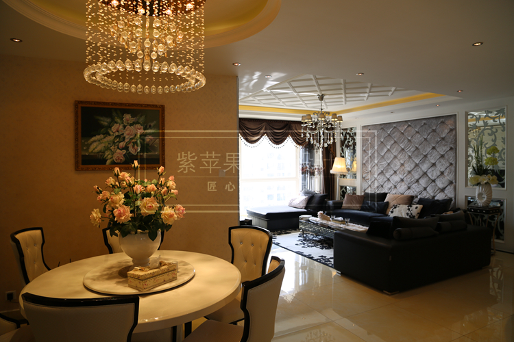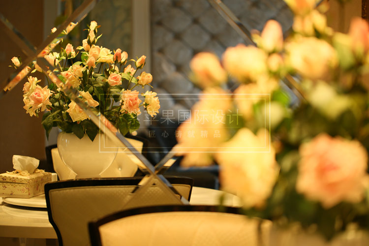 为了将欧式艺术风情发挥得力量得淋漓尽致,似乎别墅设计师把所有的注意力都放在了装饰物的铺设创造上面。象牙白的餐桌高贵典雅,点缀的花瓶就放佛湖面上的一束彩虹,花朵娇艳欲滴,映着的却是顶上华丽丽的水晶吊灯,放佛刻意为之,设计师将壁画设计成花朵的写实油画,既是现实,又是写真,交相辉映,美不胜收。一进大厅,整个人的注意力都被这个美丽典雅的餐厅吸住了目光。
