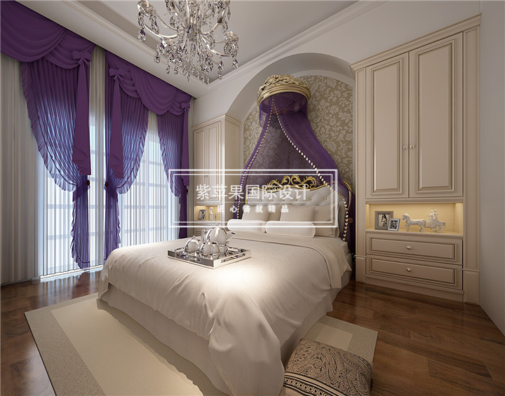 这是一种简欧风格的女儿房设计,整个空间明亮大方,高贵的水晶吊灯,乳白色的墙壁,当然最大的亮点应该是它的色彩搭配,米白色为主色调,处处体现女孩的纯真简单。窗幔和床幔的颜色选自法国普罗旺斯的薰衣草紫色,象征着爱情,代表着浪漫。如果您也想为您的宝贝设计成这样的小公举风格,那这种色彩搭配无疑是最好的选择。