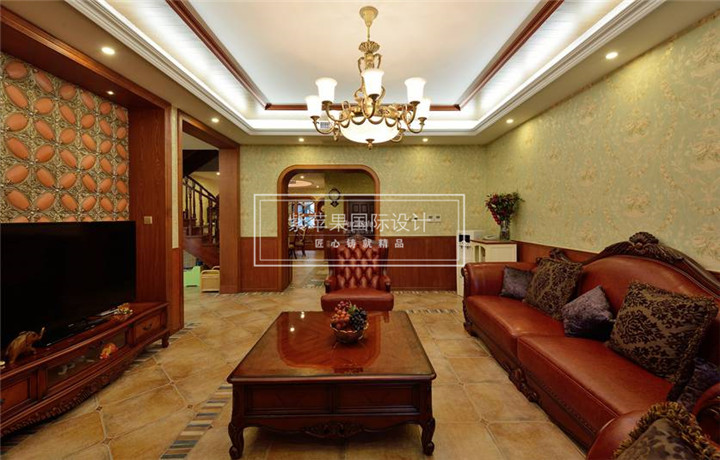 美式风格讲究一个文化感,历史感,宽大,舒适,杂糅各种风格荣威一体。反映在软装配饰上就是大量运用暗红色调的装饰,不管是沙发皮质也好还是红木家具也好,同时还采用大量的仿古瓷砖和石质材料,就像是图中的电视背景墙,不仅仅是采用了小块石头作为点缀,而且是暗红色调,无处不体现着美式风格的自由感和文化气息。