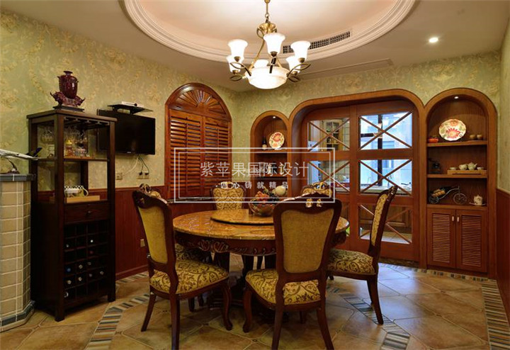 美式风格还强调其实用性,餐厅的设计也就更是如此。简单的布局,合理的设计,将此空间与其他空间分离开来,创造一个安静的就餐环境,没有过多的装饰,简单而又温馨之外又不乏贵气感和情调。