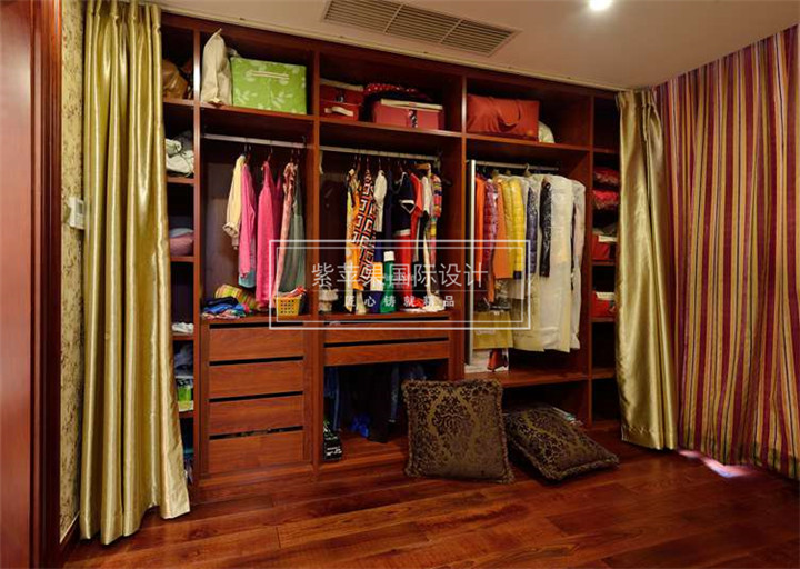 这个衣橱简直将美式风格的自由不羁体现的淋漓尽致,简单的设计但又功能区分明显,衣橱内部的格子设计巧妙,同时外部搭配一丝绸帘,高贵大气之外又能将摆放的衣物遮盖,实用性高美观性得以尽显。