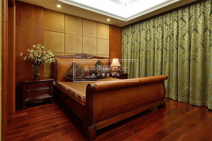 卧室的设计更多的是强调一个氛围,整体色调一致,没有过于明亮的色彩,整个氛围温馨自然。没有欧式的精雕细琢,没有过多的装饰点缀,也正迎合了美国人认为的“房子是用来住的不是用啦欣赏的”的装修观念,墨绿色的窗幔设计素雅大方。整个房间给人感觉舒适优雅,既注重生活品质,又不过分张扬。
