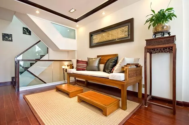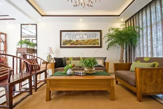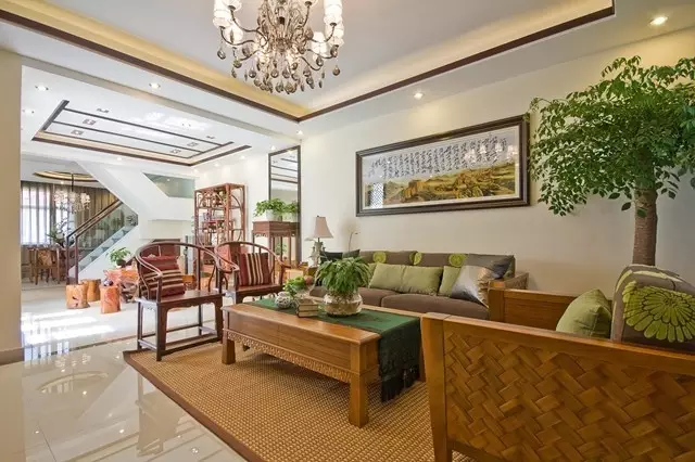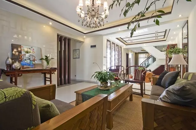 别墅设计师把当代装置艺术和中国的传统文化结合展示中国山水的意境,体现主人对现代生活方式同古老中国文化的理解。客厅空间如同一个小的庭院,绿植与水墨画的结合,让空间贴近自然,充满传统文化意境。