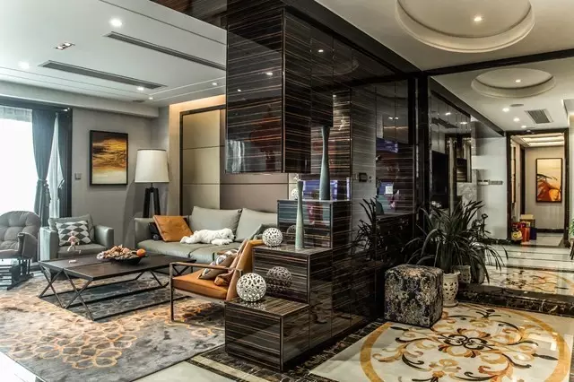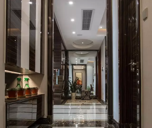 门厅的重要性对于居家体验来说最重要的不是装饰,而是收纳随身物品与更衣功能的满足。设计师利用纯天然质感的黑檀纹理搭配亮光烤漆的色泽,体现现代的科技感做到了鱼和熊掌兼得。走在空间里,能时刻感受到它的精雕细琢,时尚干练,富丽堂皇而又不失温馨。