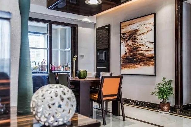 当空间里的黑色遇到耀眼的橙色,原本硬朗沉稳的背景空间被赋予温情,就像冬季里悄悄露出笑脸的太阳,将原本的沉默打破,为空间注入活力与激情,实现空间的平衡感与协调性。线条感极强的桌椅,抽象派画风装饰画,实现现代都市的时尚与华丽。