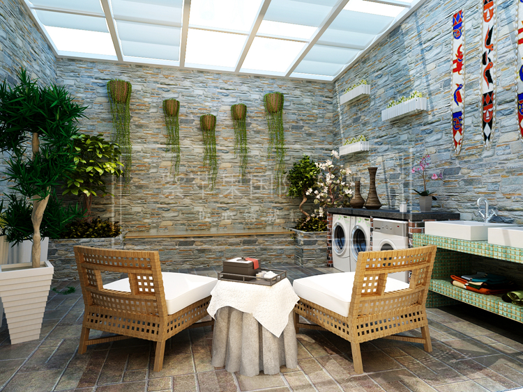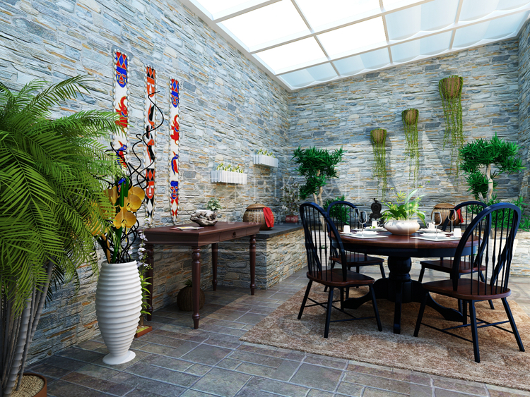 阳光房的设计保留乡村石砖围墙的设计,仿佛置身野外,宁静舒适,祥和自然。顶部采用玻璃钢屋顶,保留足够的采光,下雨天亦可以享受午后柔美时光。