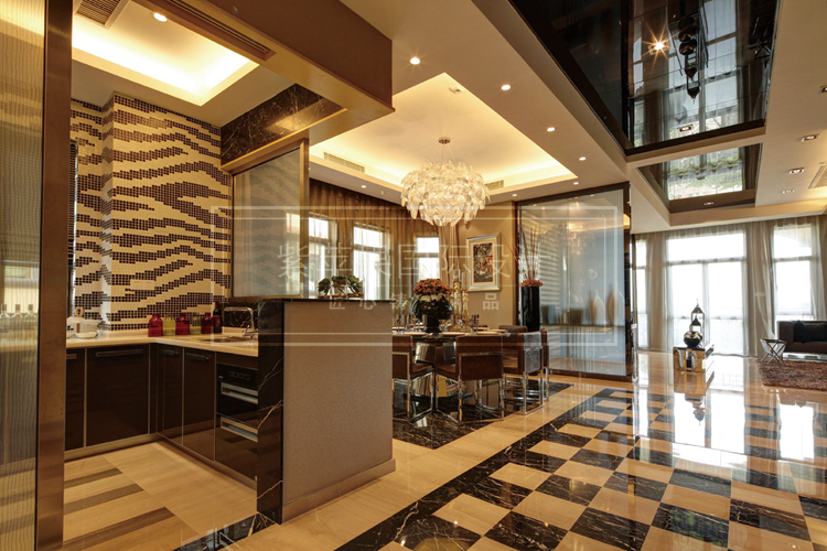 餐厅偏厅与别墅主题风格保持一致,这也是豪华别墅惯用的设计技巧:一致性!方格地板交错中创造时尚神秘的艺术感官,宽敞的大厅一览无余,大,但是大的真漂亮,真美观,真时尚。