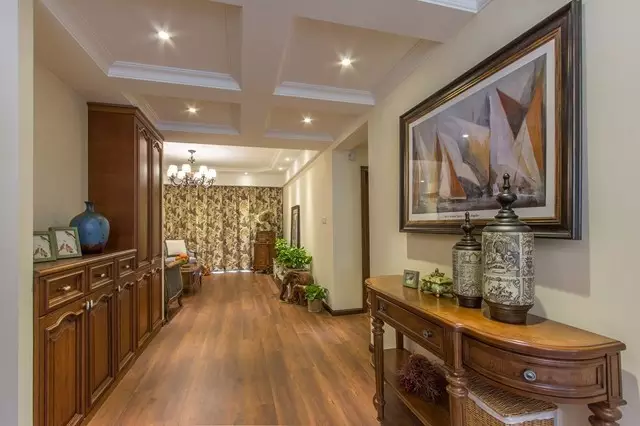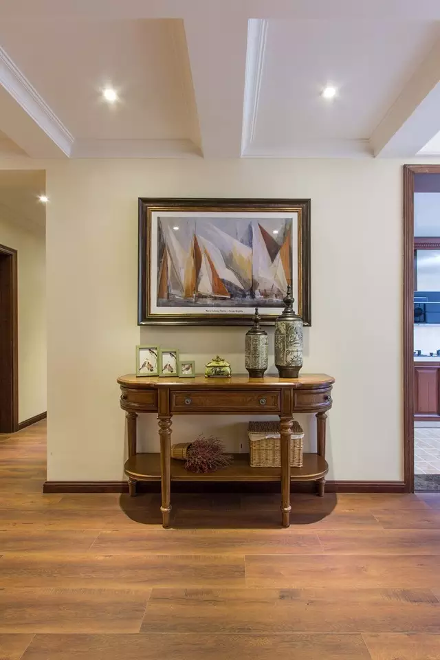 开门第一道美景,风景油画的淡雅与清新点缀在古典气息的家具当中,搭配自然气息浓厚的装饰品,于古典中带有一点随意,摒弃了过多的繁琐与奢华。营造出闲散与自在,温情与柔软的氛围,给业主一个真正温暖的家。