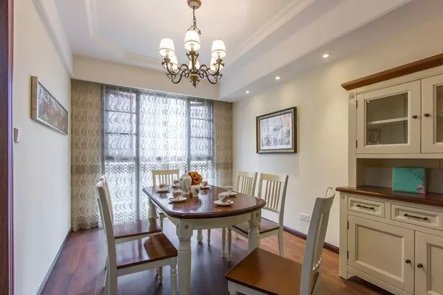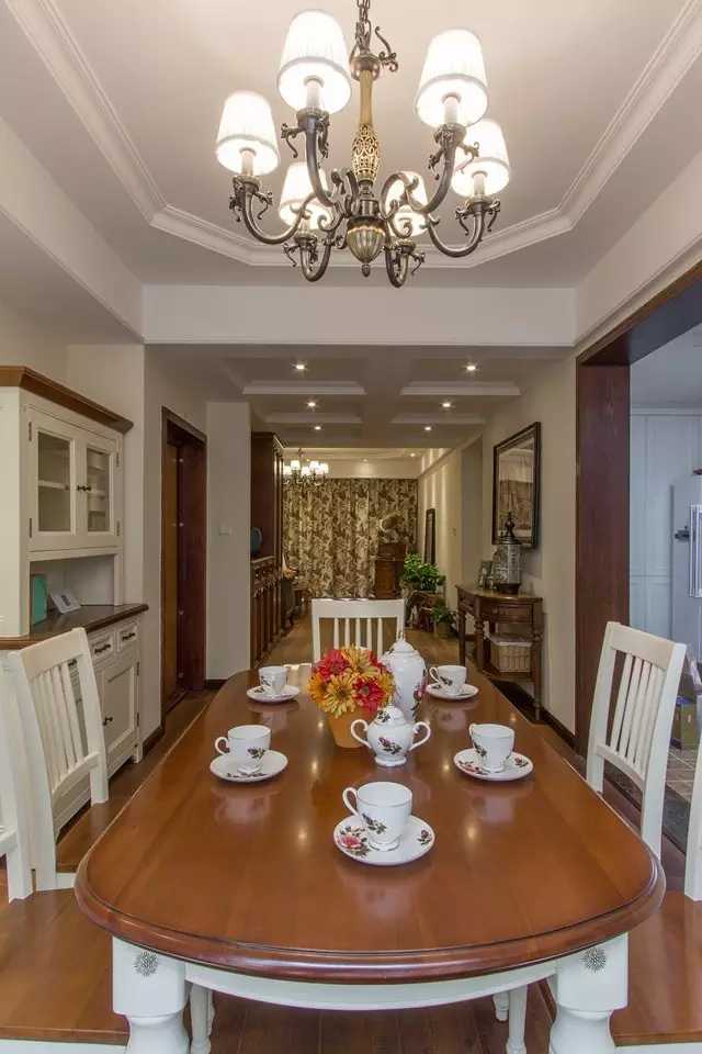 原木材质的餐桌有古典味道,搭配以白色家具,餐具,铁艺灯,传递清爽素雅的味道,反映业主质朴而实用的生活态度。