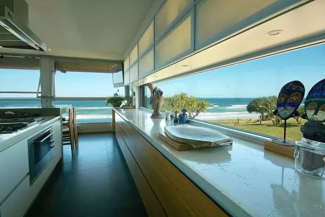 户外甲板或露台扩展的空间,是别墅带来的另一个惊喜。如果说厨房是时尚的焦点,那么滑动玻璃门、pavilion-style设计是确保遥远的海岸线进入室内,波光粼粼的海滩,那么静,那么动。