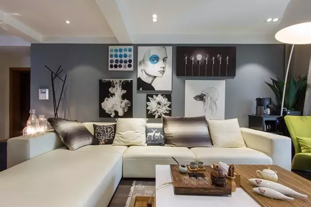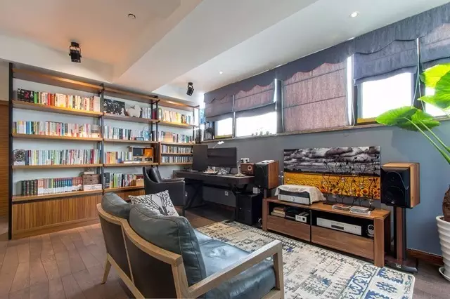 室内线条分明,利落,一杆落地钓鱼灯的以其柔美的抛物线,优雅着空间的线条感。个性鲜明的装饰画,造型别致的装点物,淋漓尽致表达着主人心中的自由与率性。