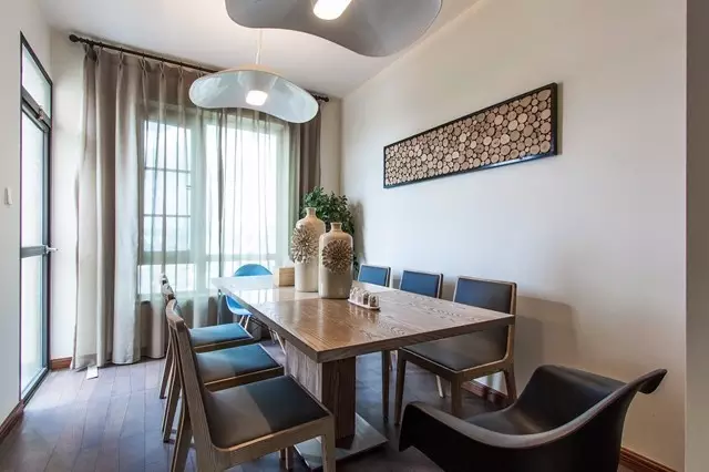 根据无餐厅,厨房面积,客厅区域面积过小等户型缺点,设计师重新进行功能规划,扩大厨房面积,增强使用功能,厨房旁边规划餐厅,让操作使用更加合理。餐厅空间里,具有设计感的餐椅与木材质地的餐桌相协调,造型别致的灯具,给人一种耳目一新的感觉。同时与厨房的简约大方相映衬,显得对称和谐。
