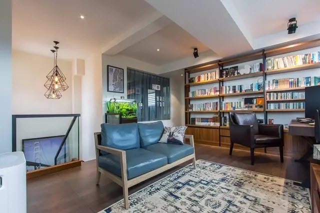 别墅设计特点:全方位开放空间的布局;充分利用自然光线来采光;简约而又带有工业色彩的设计元素。基于业主热爱阅读的特点,设计师用一个大体积书柜来放置书物,利用简单的家居布置,希望带给业主一个足够自由开阔阅读交流空间。