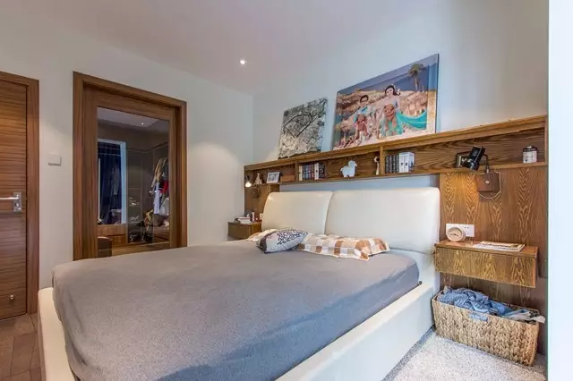 主卧的整体设计充满艺术气息与时尚情调。深木色的床头柜给人以简约而静谧的感觉,灰色的床品让空间显得雅致而舒服。床头柜足够多的收纳空间设计,既可以起到装点作用,也可以为业主生活带来便利性。
