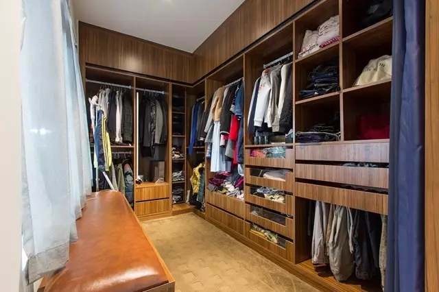 由于主卧无储物空间,紧邻卧室,设计师为业主打造一个具有足够收纳空间的独立衣帽间。深色大面积木质木柜,既沉稳大气而又充分利用空间,有着业主独特的情调,阳光照耀室内,舒心而自在。黑灰色简约的色彩,舒适气质。阳光充足,一切显得干净明亮,让卫浴空间充满品质感。