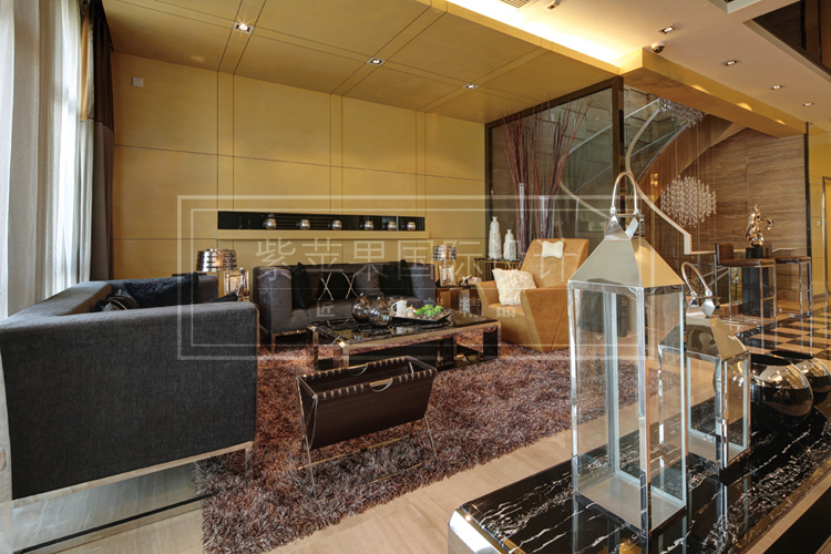 客厅延续别墅主题色彩,淡黄色墙面看上去非常温馨惬意,深空灰的沙发给空间增添几分神秘感,整体造型依旧凸显出简约风格下的线条设计,深驼色的地毯则为客厅增加几分低调奢华的品味。