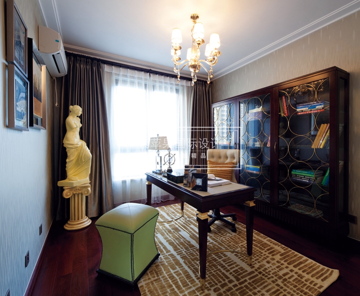 欧式风格的书房,设计师稍加改造,维纳斯的雕像很好的阐释了业主高雅的艺术品位,简单的桌案摆设丝毫不显凌乱,空间虽小,但艺术的气息早已渗透在整个别墅中。在这里看书,恐怕思绪早就随着艺术的线连接到了更高的精神层面。